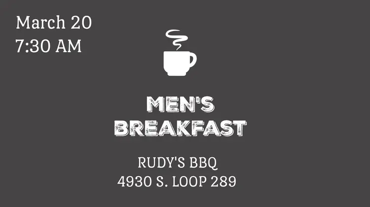 Join us March 20th, at 7:30 AM for breakfast at Rudy’s BBQ, 4930 S. Loop 289. This is a great time to get to know other men in the church… and bring a guest!
